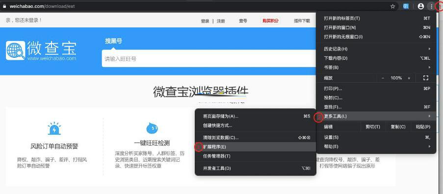 首先,你需要安装微查宝的插件,点击浏览器上方状态栏,点击“扩展”