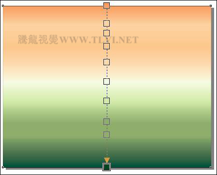 提示:为矩形填充渐变色从下至下依次为桃黄,杏黄,浅黄色(C0、M17、Y34、K0),沙黄,淡黄色(C0、M13、Y25、K0),淡绿色(C2、M0、Y9、K0),绿色(C11、M1、Y35、K0),马丁绿,马丁绿,深绿色(R9、G66、B22)。