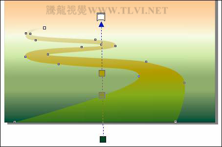 “贝塞尔”工具,参照图10-38所示绘制小河路径图形,并为其填充渐变色,渐变色从下至上依次为深绿色(R9、G66、B22),黄绿色(C42、M32、Y99、K2),芥子色(C0、M10、Y100、K30),白色。
