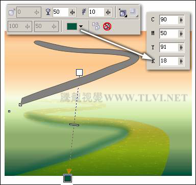 “挑选”工具,按下小键盘上<+>键,将小河图形原位置再制,接着选择工具箱中的