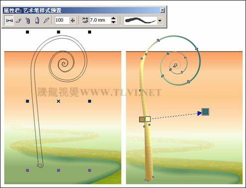 “艺术笔”工具,参照图10-44左图所示为曲线添加艺术笔效果。