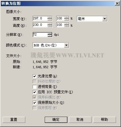 (15)执行“文件”→“导出”命令,打开“导出”对话框,将图形导出为“彩色铅笔画”,导出格式为“TIF-TIFF bitmap”格式,接着单击“导出”按钮,打开“转换为位图”对话框,参照图10-48所示设置对话框,将图形导出。