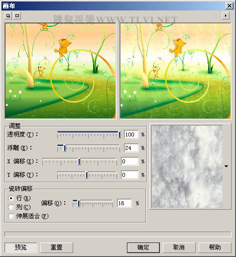(10)确认“对象 6”为编辑状态,执行“效果”→“底纹”→“画布”命令,打开“画布”对话框,参照图10-59所示设置对话框,为图像添加画布效果。
