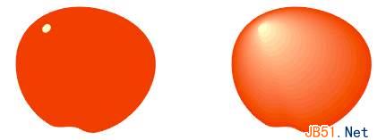 (2)填充为红色,在它里面左上方的位置画一个小圆,填充为浅黄色(Pale Yellow);选中这两个图形,右击调色板中的无填充色块取消它们的轮廓颜色,现在选取互动式渐变工具拖动小圆到大圆上,在属性栏中设置“渐变的层次数”为20,现在我们制作出了苹果表面的高亮效果,如图: