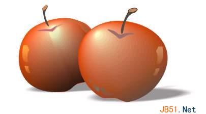 (5)制作另一个苹果。选中刚才做好的苹果并进行复制,将复制对象解散群组,选中苹果的外轮廓图形,用造形工具稍稍改变它的形状,使这两个苹果略有不同;并将原来表面的阴影图形的形状也做相应的改变,因为这个苹果位于刚才那个苹果的后面,所以它表面的阴暗部分面积应该更大一些,拖动透明度工具手柄中间的滑块滑向黑色方块,以加重它的不透明效果;对于其他物体,你都要做一下调整,直至你满意为止,最后也要在它的底部加上阴影效果,如图: