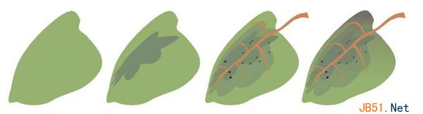 (6)在这个苹果的叶柄上加上一片叶子。用贝兹曲线工具画出叶子的轮廓,填充为叶绿色(Martian Green);然后将它复制并将复制对象缩小,然后设置复制对象的颜色为一种深绿色(Acocado Green);选取互动式变形工具选中它左边边缘一点并向左拖动,在属性栏中单击“推与拉变形”*按钮,并设置“推与拉变形幅度”的值为-26,这样做的目的是下一步执行渐变操作时能够得到一个颜色自然过渡的图形。现在取消它们的轮廓颜色,选取互动式渐变工具拖动变形的图形到叶子的轮廓图形上,设置“渐变的层次数”为1,这是一片有渐变颜色的叶子。用手绘工具在渐变组的表面画出叶脉的形状,并画一些黑色的小椭圆形作为杂点散步在叶子上,最后在叶子的表面上也要加上一个半透明的轮廓图形,这样会使叶子的颜色看起来更有真实感,效果如图: