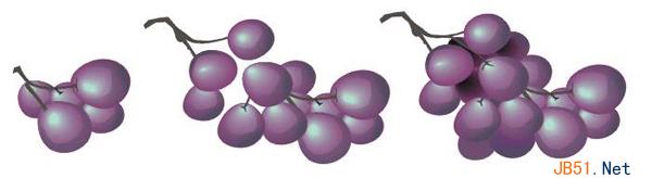 (9)做出来许多不同形态的葡萄颗粒组成一串葡萄,这需要一些必不可少的手工劳动。我的排列方法是这样:先排列组成葡萄的下半部分,然后用手绘工具画出一些枝干,将它们连接起来;再画出上半部分靠在外边的几个颗粒和另一些枝干;最后在这些图形的背后添加一些更深颜色的颗粒以产生前明后暗的景深效果,当然少不了一些细致的调节工作,过程可以参考下图: