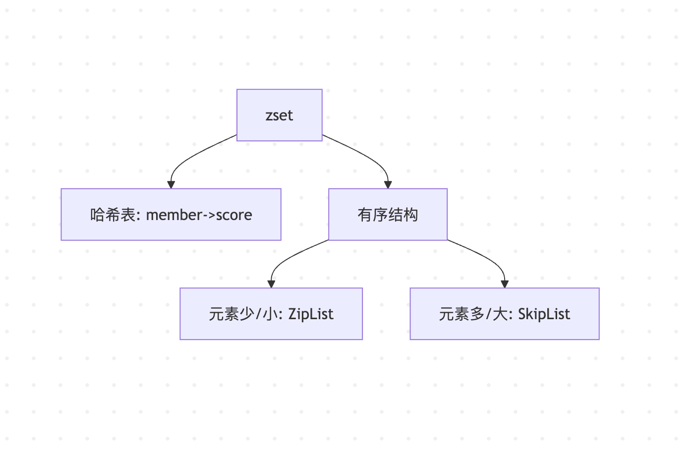 理解了zset的基本概念后,我们来看看Redis是如何实现它的。Redis的zset实际上使用了两种数据结构组合来实现: