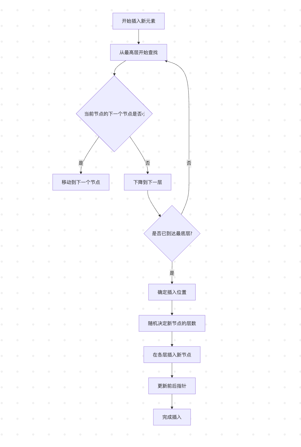 以上流程图说明了在跳跃表中插入一个新元素的完整过程。关键在于从高层开始快速定位,然后逐步精确到插入位置,最后通过随机算法决定新节点的层数。