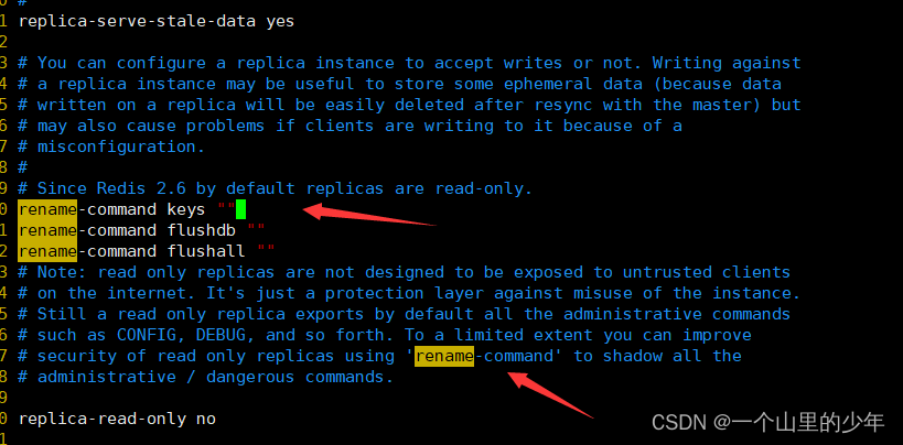 如果我们想要禁用这些命令我们可以在redis.conf 默认配置文件,找到 SECURITY 区域,如以下所示: