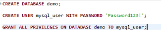 -- 建个新数据库 CREATE DATABASE demo; -- 创建个用户 CREATE USER mysql_user WITH PASSWORD 'Password123!'; -- 给用户权限 GRANT ALL PRIVILEGES ON DATABASE demo TO mysql_user;