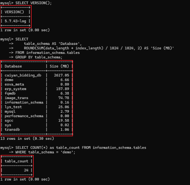 -- 看看MySQL版本 SELECT VERSION(); -- 算算数据库有多大 SELECT table_schema AS 'Database', ROUND(SUM(data_length + index_length) / 1024 / 1024, 2) AS 'Size (MB)' FROM information_schema.tables GROUP BY table_schema; -- 数数有多少张表 SELECT COUNT(*) as table_count FROM information_schema.tables WHERE table_schema = '你的数据库名';