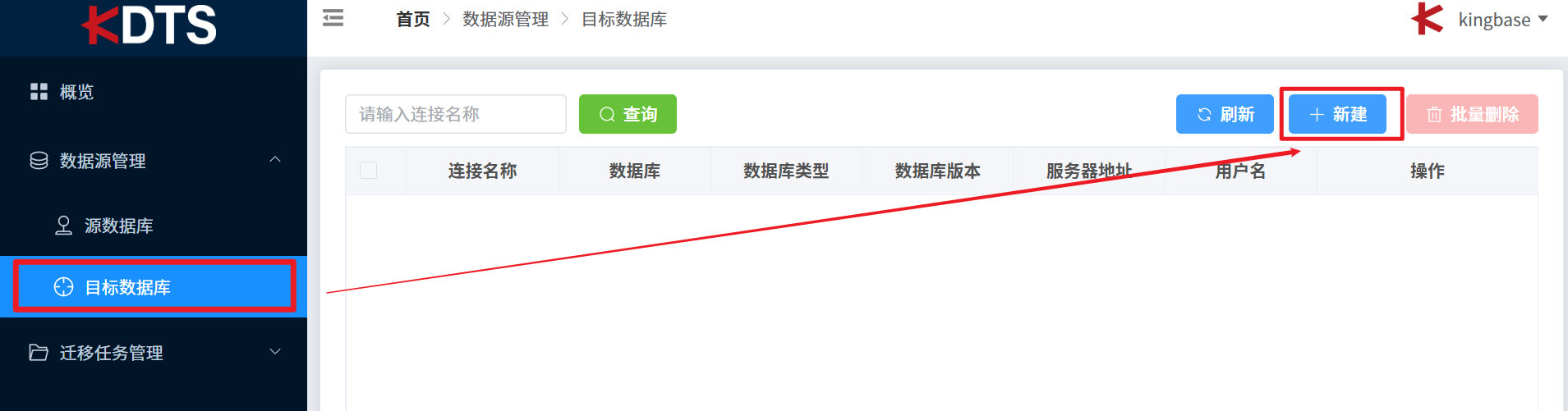 点击"数据源管理" → “目标数据库” → “+ 新建”