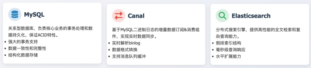 - 容量匹配:通过并行处理、批量操作等手段平衡各环节吞吐量。在高并发场景下,避免出现某个环节成为性能瓶颈,导致数据堆积和延时增加。例如,Canal 的并行解析和 ES 的批量写入,都是为了提升整体链路的处理能力,确保数据能够高效、流畅地在各环节间流转。