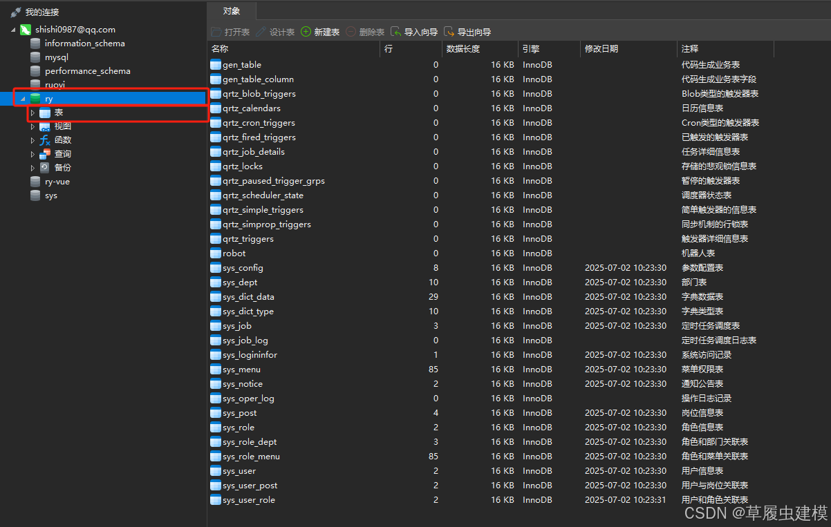 在左侧,展开你的连接,找到刚新建的数据库名(如 ry