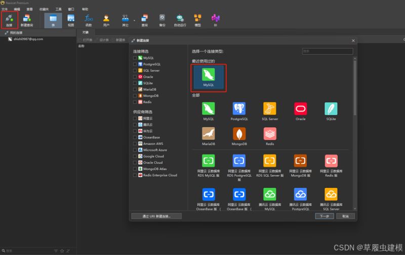 点击左上角 “连接” 按钮,选择你对应的数据库类型(如 MySQL)。