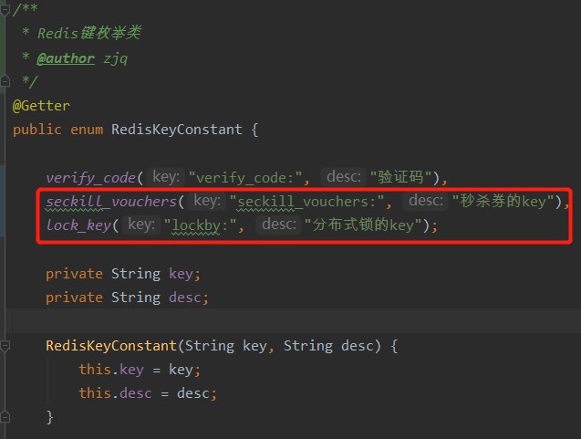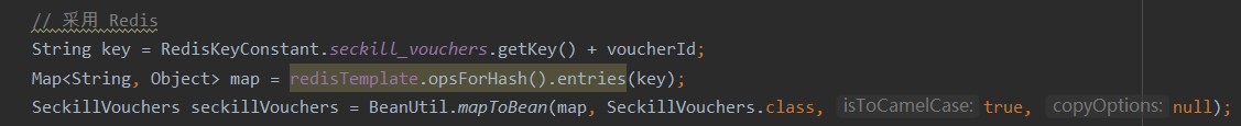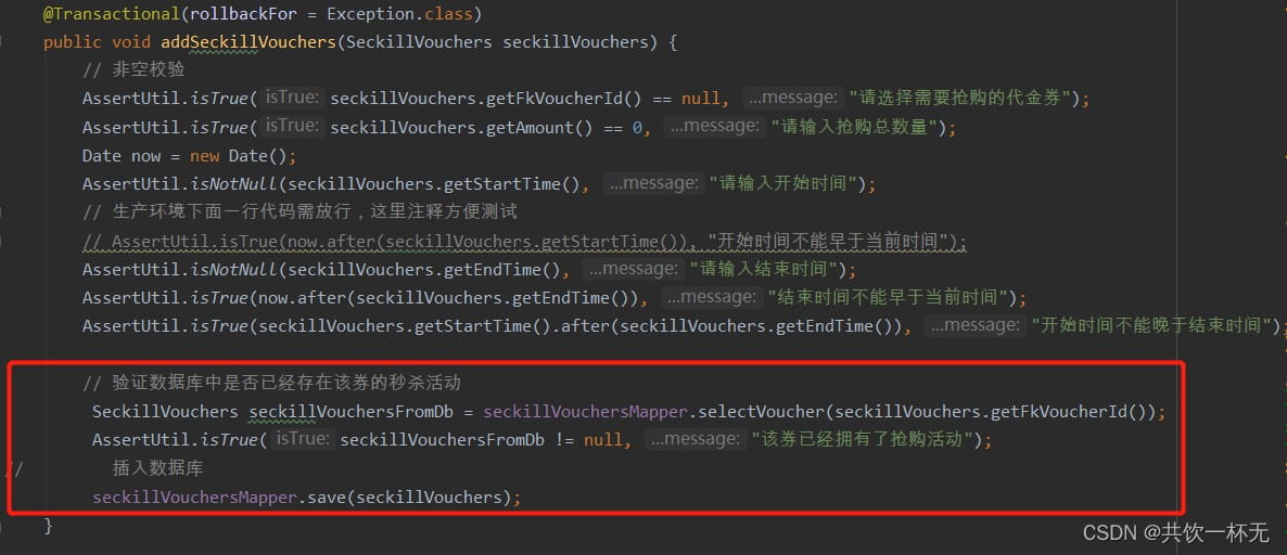 // 采用 Redis 实现 String key = RedisKeyConstant.seckill_vouchers.getKey() + seckillVouchers.getFkVoucherId(); // 验证 Redis 中是否已经存在该券的秒杀活动 Map<String, Object> map = redisTemplate.opsForHash().entries(key); AssertUtil.isTrue(!map.isEmpty() && (int) map.get("amount") > 0, "该券已经拥有了抢购活动"); // 插入 Redis seckillVouchers.setIsValid(1); seckillVouchers.setCreateDate(now); seckillVouchers.setUpdateDate(now); redisTemplate.opsForHash().putAll(key, BeanUtil.beanToMap(seckillVouchers));