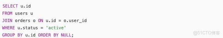- ORDER BY NULL 告诉MySQL:别再排序了,直接分组结果就行。这样能避免文件排序,大幅提速。