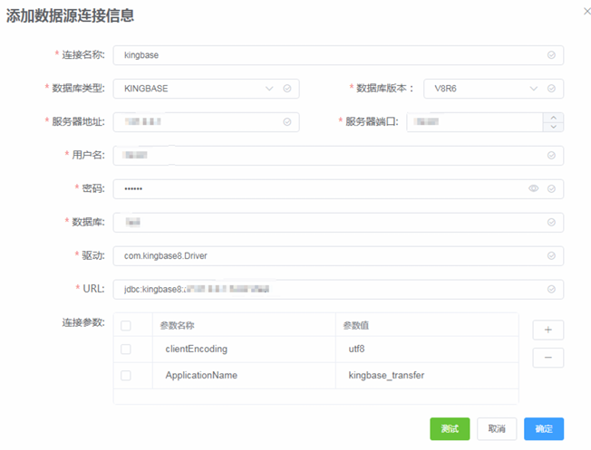 创建目标数据库连接。创建数据库连接界面如下,填写数据源信息,包括:“连接名称”、“数据