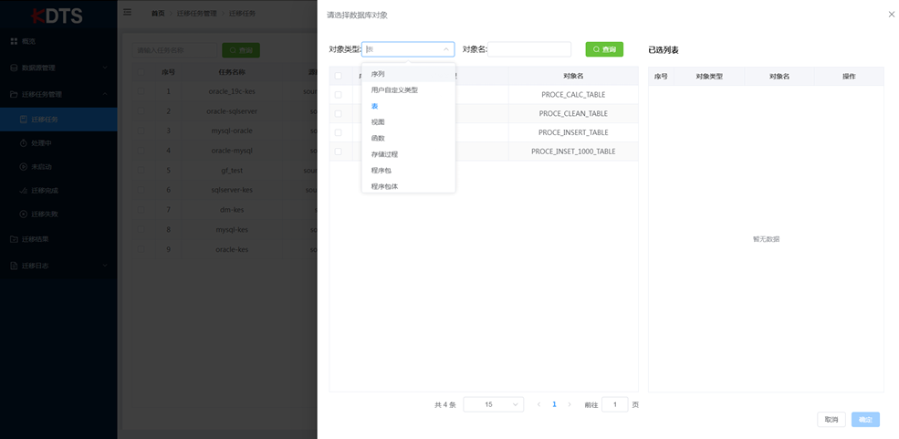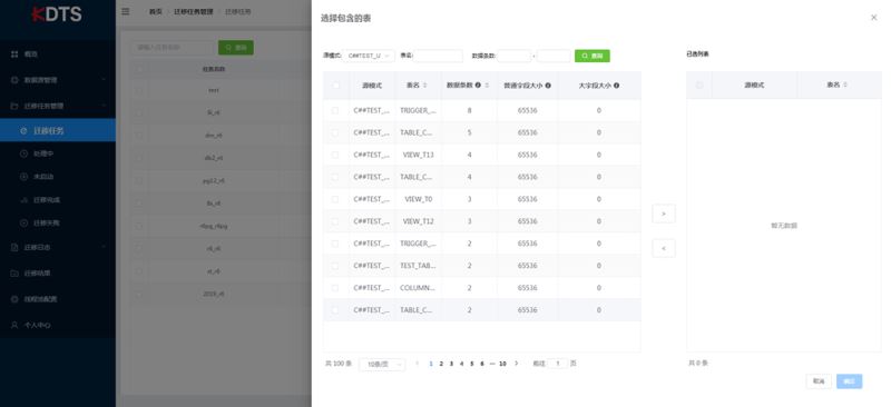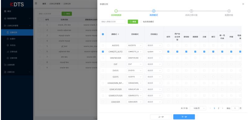 通过已选模式选择我们需要迁移数据的表,模式较多时可在已选模式搜索框内输入模式名关键字进行快速检索。