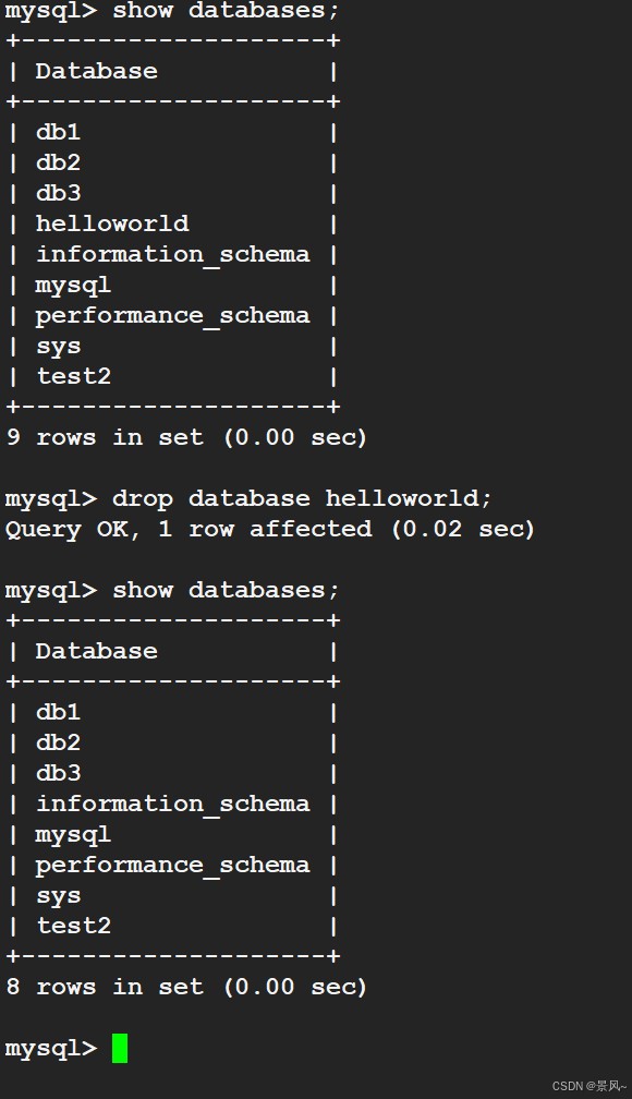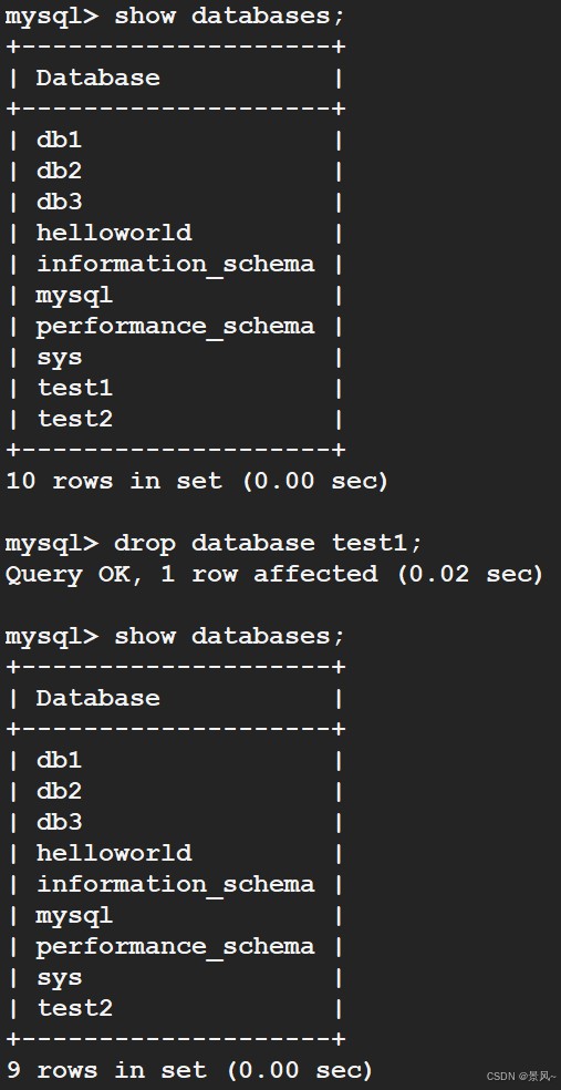 并且删除数据库后,该数据库下的所有表也都会被级联删除,因此不要随意删除数据库。