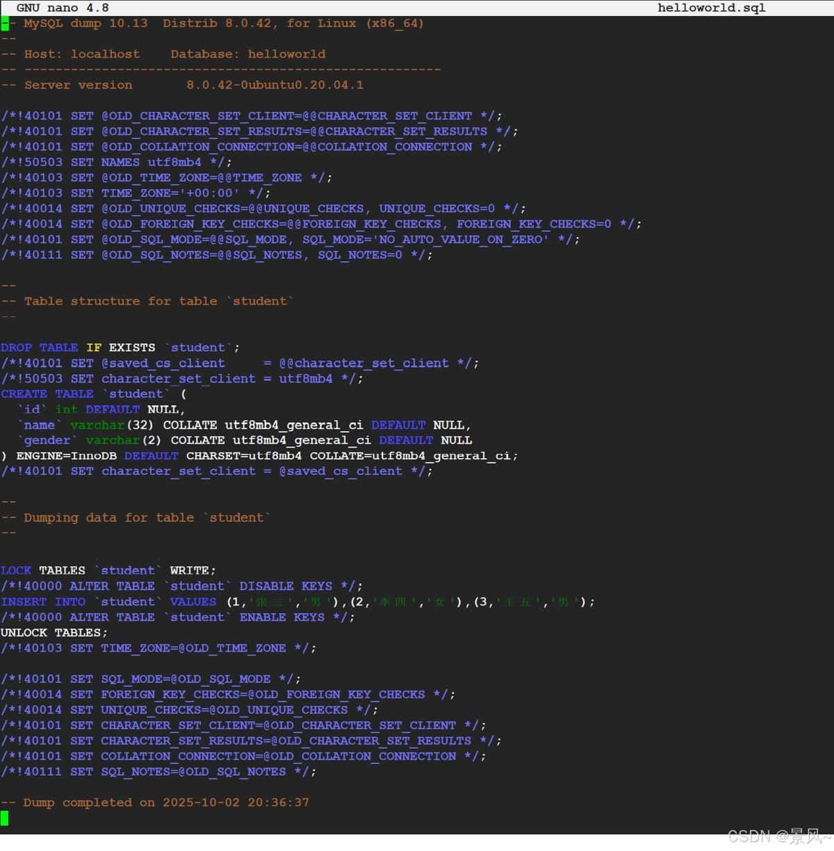打开helloworld.sql文件即可看到,文件中的内容实际就是我们在该数据库中执行的各种SQL命令,包括创建数据库、创建表、插入数据等SQL语句。如下: