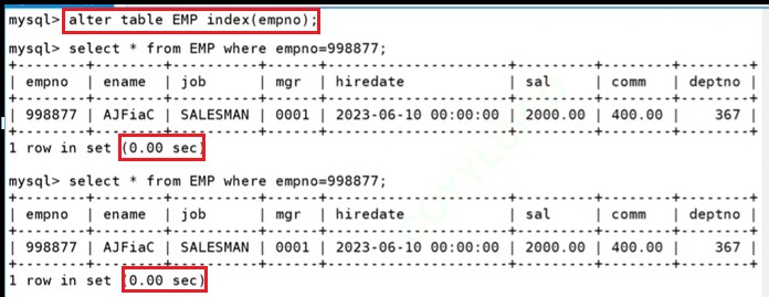 //在表的定义最后,指定某列为索引 create table user8(id int primary key, name varchar(20), email varchar(30), index(name) ); //创建完表以后指定某列为普通索引 create table user9(id int primary key, name varchar(20), email varchar(30)); alter table user9 add index(name); //创建一个索引名为 idx_name 的索引 create table user10(id int primary key, name varchar(20), email varchar(30)); create index idx_name on user10(name);