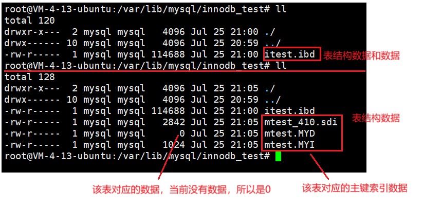 innodb引擎 create table itest( id int primary key, name varchar(11) not null )engine=InnoDB; MyISAM引擎 create table mtest( id int primary key, name varchar(11) not null )engine=MyISAM;