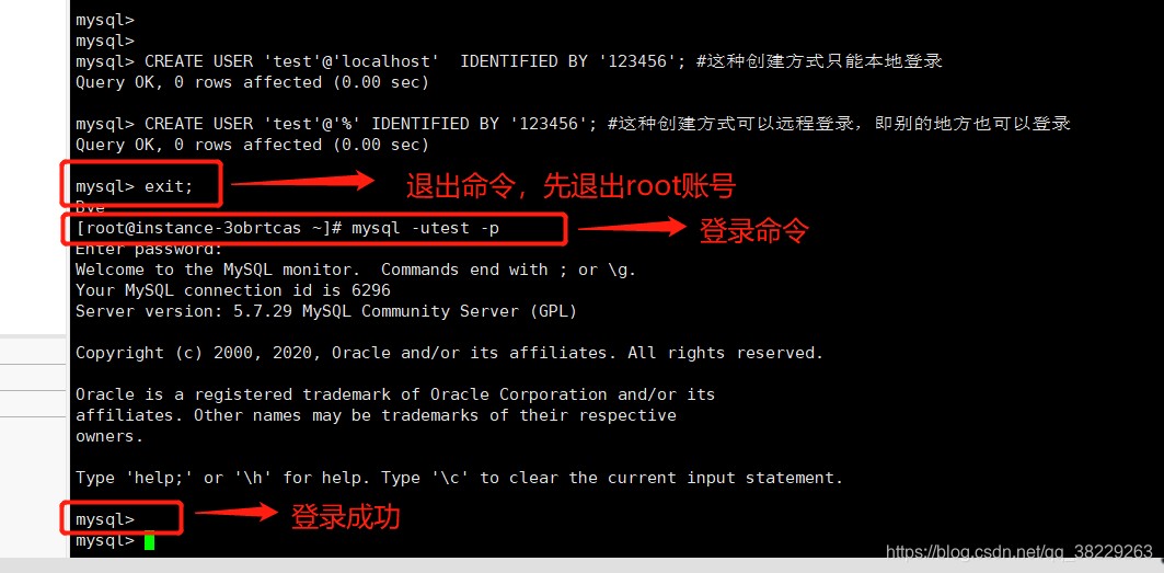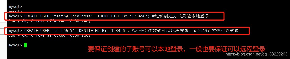 CREATE USER 'test'@'localhost' IDENTIFIED BY '123456'; #这种创建方式只能本地登录 CREATE USER 'test'@'%' IDENTIFIED BY '123456'; #这种创建方式可以远程登录,即别的地方可以登录