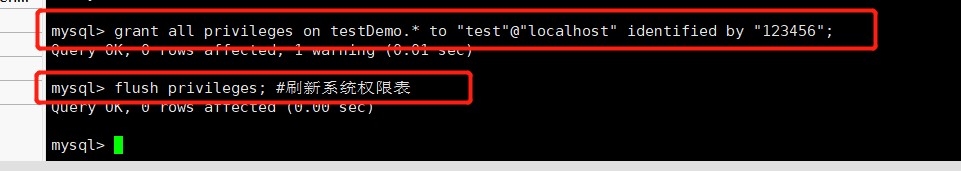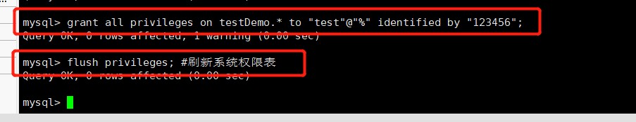 grant all privileges on testDemo.* to "test"@"%" identified by "123456"; flush privileges; #刷新系统权限表