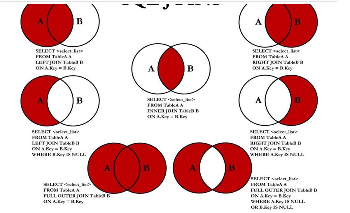 #中图:内连接 A∩B SELECT employee_id,last_name,department_name FROM employees e JOIN departments d ON e.`department_id` = d.`department_id`; #左上图:左外连接 SELECT employee_id,last_name,department_name FROM employees e LEFT JOIN departments d ON e.`department_id` = d.`department_id`; #右上图:右外连接 SELECT employee_id,last_name,department_name FROM employees e RIGHT JOIN departments d ON e.`department_id` = d.`department_id`; #左中图:A - A∩B SELECT employee_id,last_name,department_name FROM employees e LEFT JOIN departments d ON e.`department_id` = d.`department_id` WHERE d.`department_id` IS NULL #右中图:B-A∩B SELECT employee_id,last_name,department_name FROM employees e RIGHT JOIN departments d ON e.`department_id` = d.`department_id` WHERE e.`department_id` IS NULL SELECT employee_id,last_name,department_name FROM employees e LEFT JOIN departments d ON e.`department_id` = d.`department_id` WHERE d.`department_id` IS NULL UNION ALL #没有去重操作,效率高 SELECT employee_id,last_name,department_name FROM employees e RIGHT JOIN departments d ON e.`department_id` = d.`department_id`; #右下图 #左中图 + 右中图 A ∪B- A∩B 或者 (A - A∩B) ∪ (B - A∩B) SELECT employee_id,last_name,department_name FROM employees e LEFT JOIN departments d ON e.`department_id` = d.`department_id` WHERE d.`department_id` IS NULL UNION ALL SELECT employee_id,last_name,department_name FROM employees e RIGHT JOIN departments d ON e.`department_id` = d.`department_id` WHERE e.`department_id` IS NULL