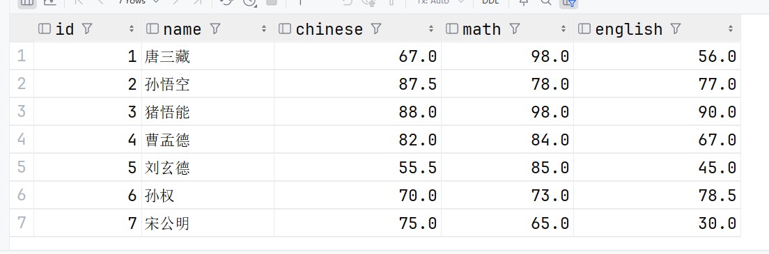 select id,name,math from exam;