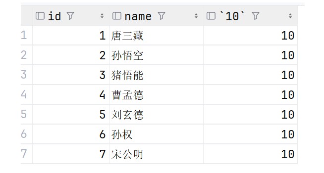 select id ,name ,10 from exam;