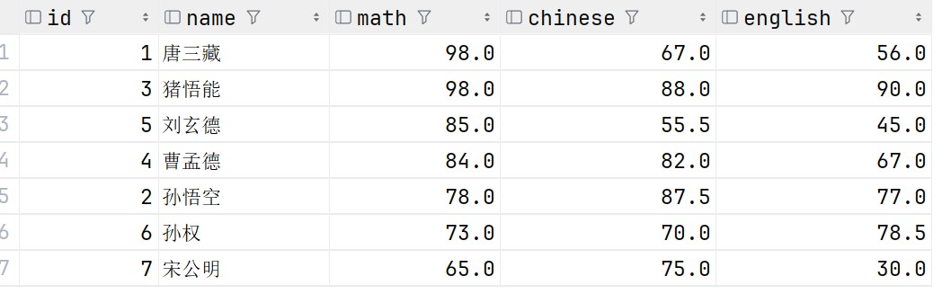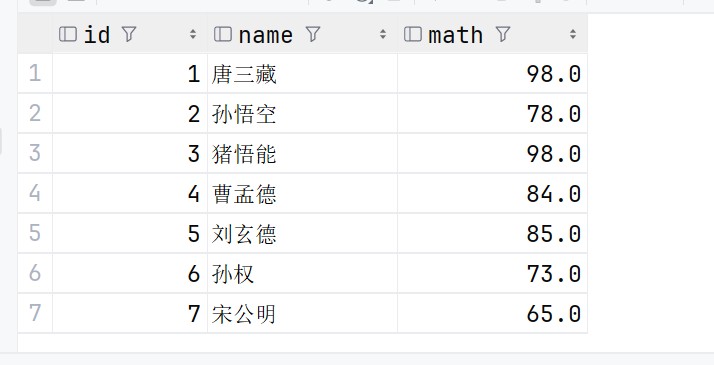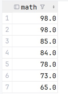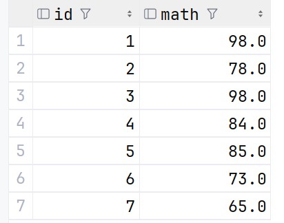 去重查询是通过关键字 distinct 来实现的,在之前的math中,是存在一个重复的98的,我们来试验一下去重查询操作: