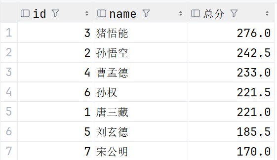 select id ,name, math + chinese + english as '总分' from exam order by math + chinese + english desc;