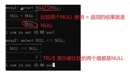 <=> | 表示等于,是专门针对null判断的,例如null <=> null 的结果为1 |