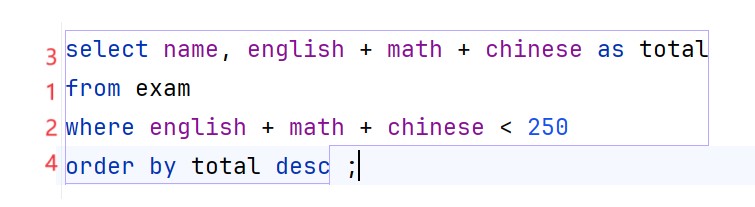 select name, english + math + chinese as total from exam where english + math + chinese < 250 order by total desc ;