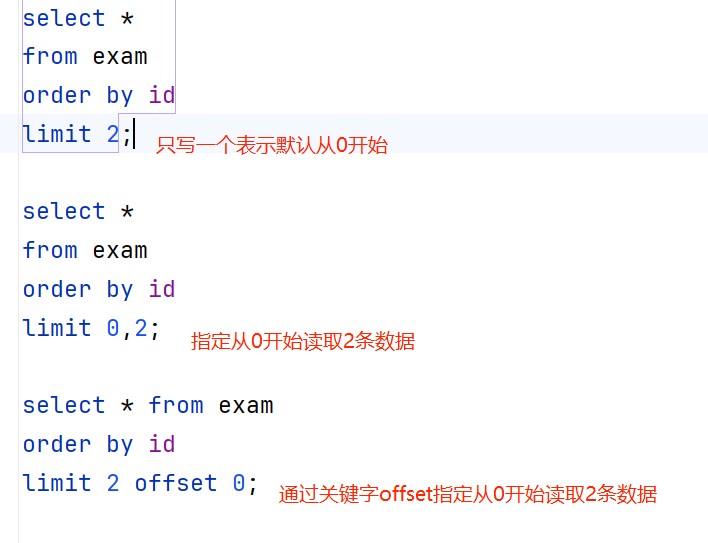 -- 从第0条开始往后读取2条数据 select * from exam order by id limit 2; select * from exam order by id limit 0,2; select * from exam order by id limit 2 offset 0;