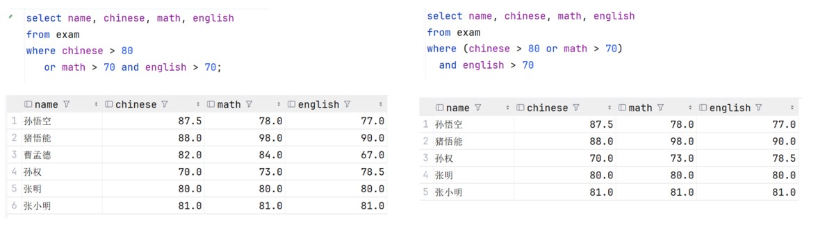 -- 比较and 和 or 的运算优先级 select name, chinese, math, english from exam where chinese > 80 or math > 70 and english > 70; select name, chinese, math, english from exam where (chinese > 80 or math > 70) and english > 70