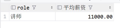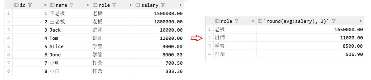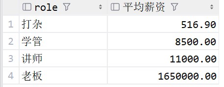 -- 根据角色进行分组,显示出角色和平均薪资,使用round四舍五入 select role, round(avg(salary), 2) from emp group by role;