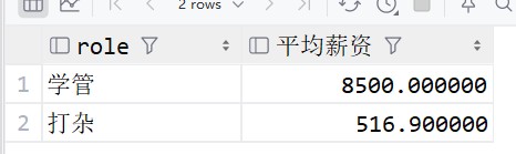 -- 对分组后的数据进行过滤 select role, round(avg(salary), 2) as 平均薪资 from emp group by role having 平均薪资 > 10000 and 平均薪资 < 100000;