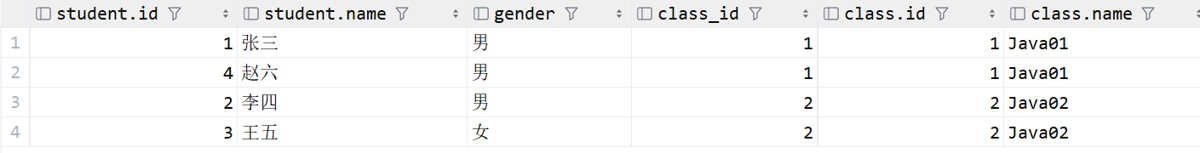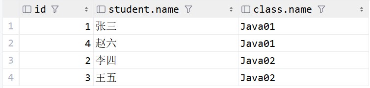 -- 写法2 select s.id, s.name, c.name from student s inner join class c on class_id = c.id;