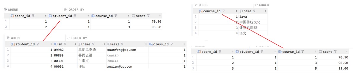 -- 获取课程 id select course_id from course where name = '语文' or name = '英文'; select * from score where course_id = 4 or course_id = 6;
