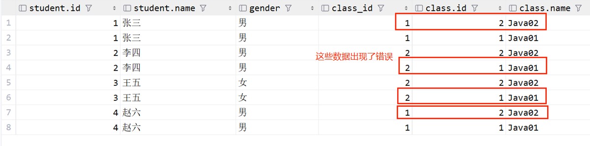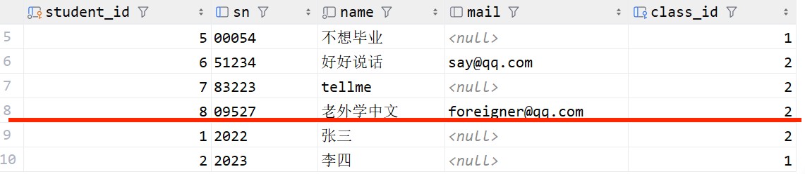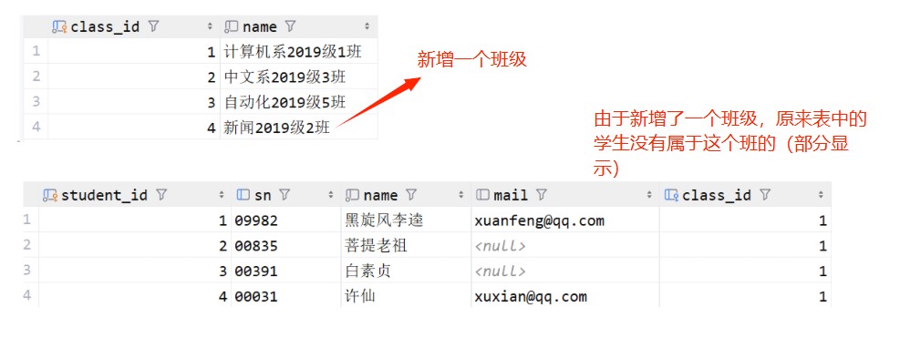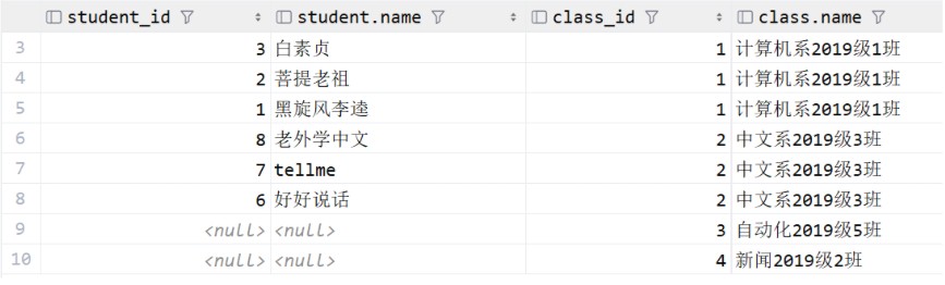 这里从 student 表到 class 表建立右外连接,没有学生的班级id也会显示出来,用null代替
