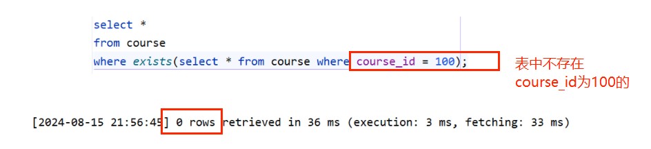 select * from course where exists(select * from course where course_id = 100);