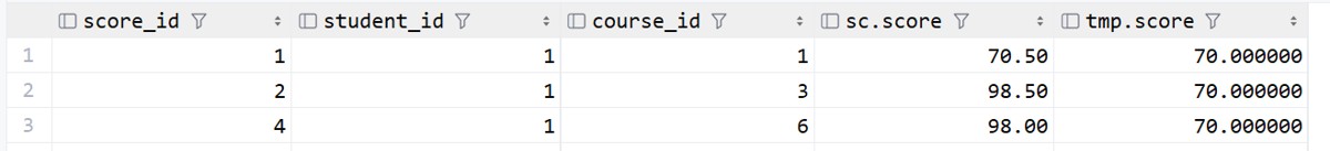 -- 用表中的真实成绩和临时表比较 select *from score sc, (select avg(sc.score) score -- 这里要起别名 from score sc, student st, class c where c.class_id = st.class_id and st.student_id = sc.student_id and c.name = '中文系2019级3班') tmp where sc.score > tmp.score;