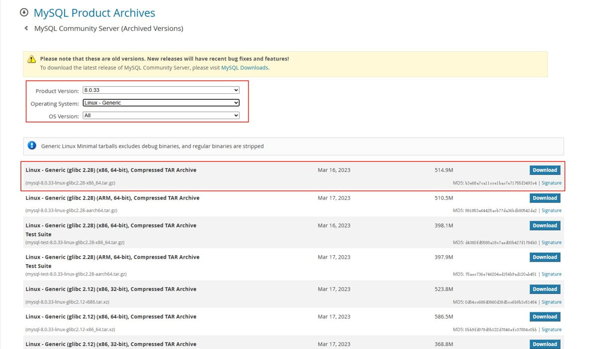 cd /data wget https://dev.mysql.com/get/Downloads/MySQL-8.0/mysql-8.0.33-linux-glibc2.12-x86_64.tar.xz. # 可选:校验 sha256(从官网下载页复制对应校验值) # sha256sum mysql-8.0.33-linux-glibc2.12-x86_64.tar.xz