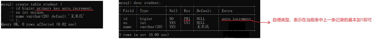 - PRIMARY KEY 主键约束,可以看做是 NOT NULL 和 UNIQUE 的组合,可以用一个 bigint 类型列为表单独指定主键,同时也可以指定主键自增,用 auto_increment 关键字,自增操作时,会找到当前列中最大的值,然后在这个基础上加 1(+1)