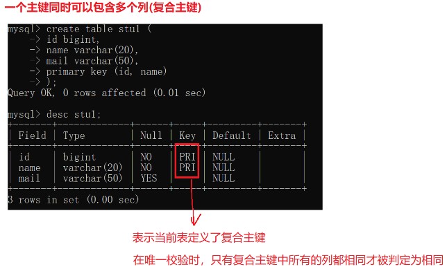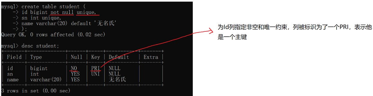 - 如果设置一个字段非空且唯一(id bigint not null unique)在desc查询表结构的时候会显示id的key为PRI