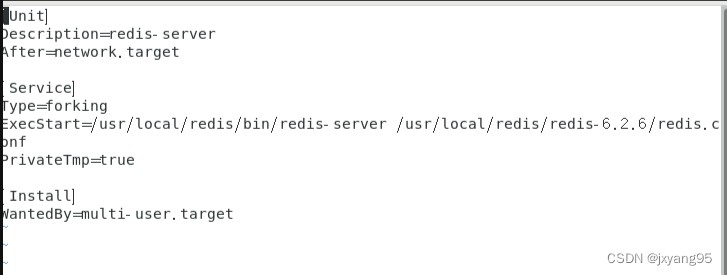 [Unit] Description=redis-server After=network.target [Service] Type=forking ExecStart=/usr/local/redis/bin/redis-server /usr/local/redis/redis-6.2.6/redis.conf PrivateTmp=true [Install] WantedBy=multi-user.target
